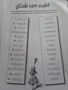 Consigna: La actividad de hoy consiste en lo siguiente: En la columna de la izquierda hay un listado de palabras con sus letras desordenadas, tienen que descubrir a que palabras de la columna de la derecha corresponden.